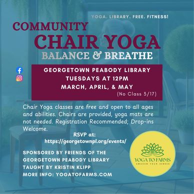 Join us for a 50-minute all-levels lunchtime chair yoga class, led by Kristin Klipp. This complimentary session is generously sponsored by the Friends of the Georgetown Peabody Library and is perfect for a mid-day reset.